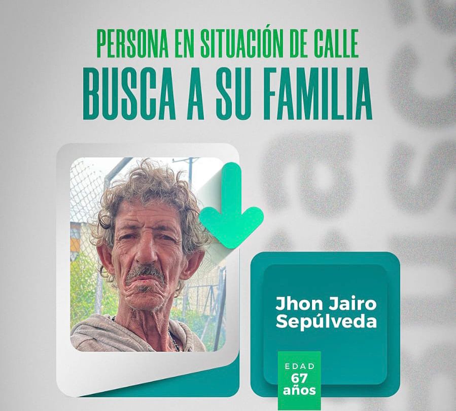 La Secretaría de Desarrollo Social informó que Jhon Jairo Sepúlveda, de 67 años y en situación de calle, recibe apoyo institucional para localizar a sus hermanas Eugenia, Claudia e Inés Sepúlveda, quienes residen en la ciudad de Cali. Jhon Jairo llegó a Armenia a los 23 años y desde entonces se ha dedicado al reciclaje como medio de sustento; actualmente, su condición ha dificultado mantener contacto con su familia.