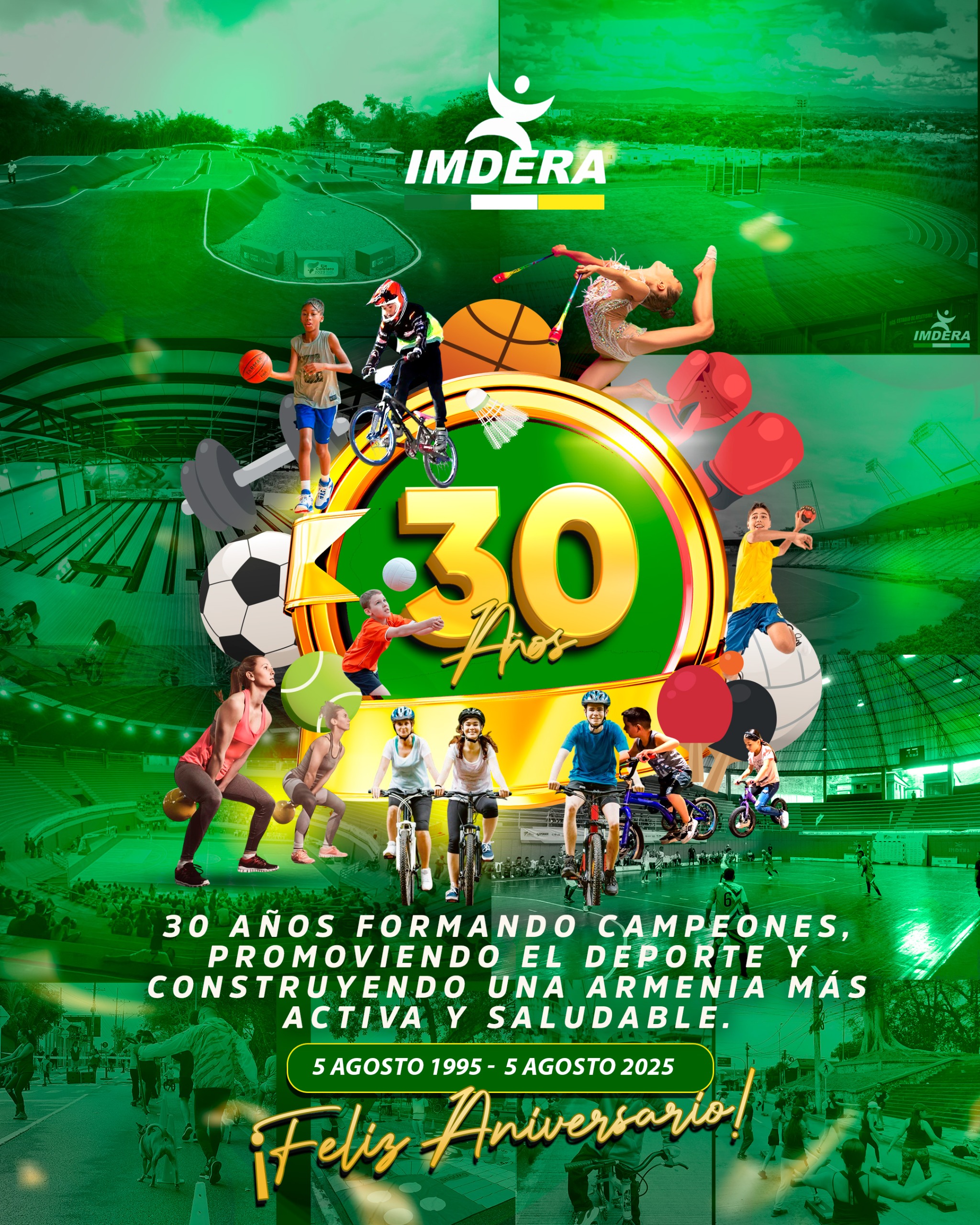 Armenia se prepara para una noche especial cuando este jueves 20 de noviembre el Instituto Municipal del Deporte y la Recreación de Armenia (Imdera) celebrará tres décadas de existencia, crecimiento y servicio a la ciudad. Son 30 años impulsando el deporte, la recreación y la actividad física en cada barrio, en cada parque, con niños, jóvenes, adultos, adultos mayores y familias enteras que hoy reconocen al instituto como parte fundamental de su historia.
