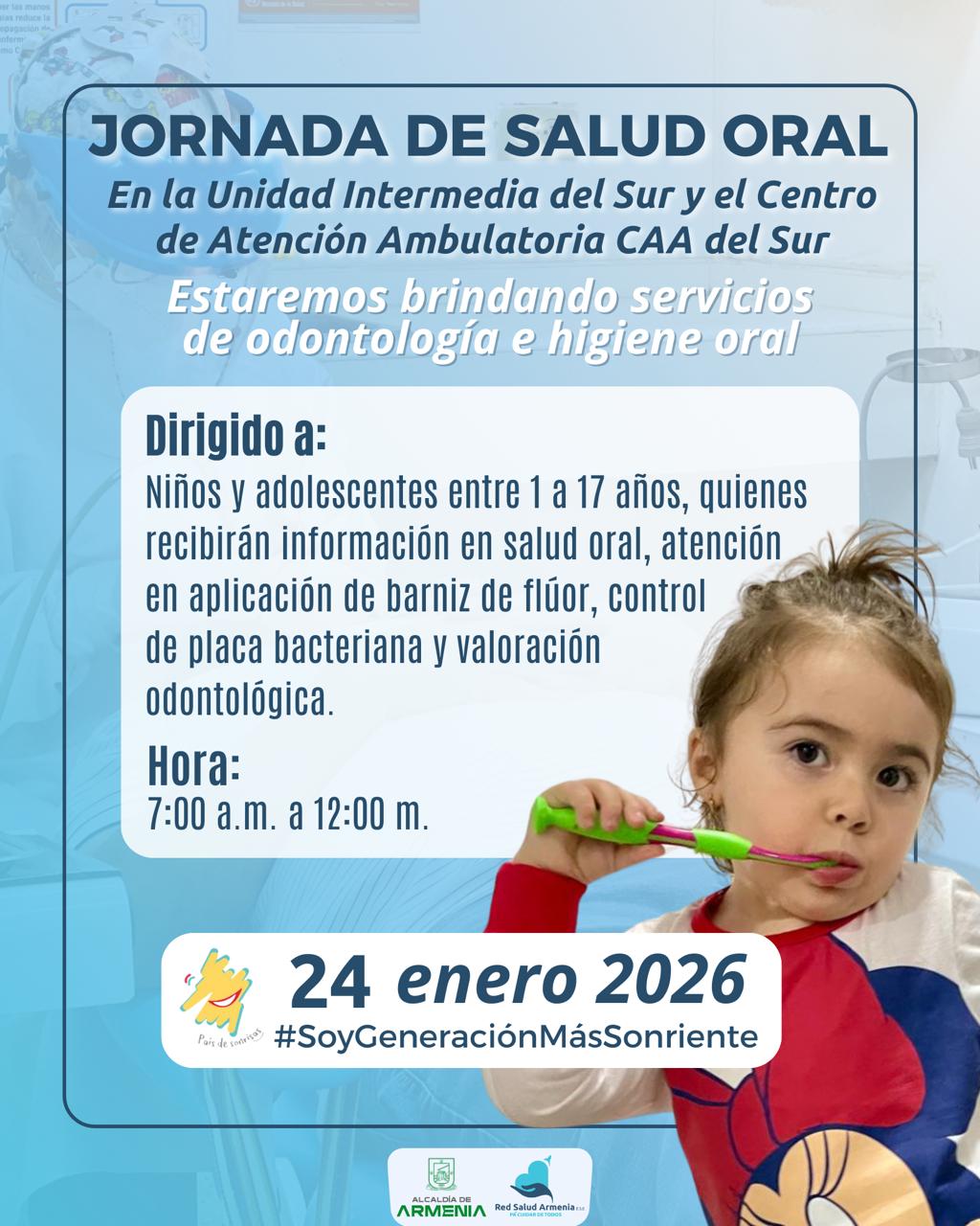En el marco de la estrategia Soy Generación Más Sonriente, Red Salud Armenia ESE realizará una jornada especial de salud oral dirigida a niños, niñas y adolescentes del municipio, con el propósito de promover el cuidado de la salud bucal y fortalecer un acercamiento positivo, confiable y humanizado a los servicios odontológicos.