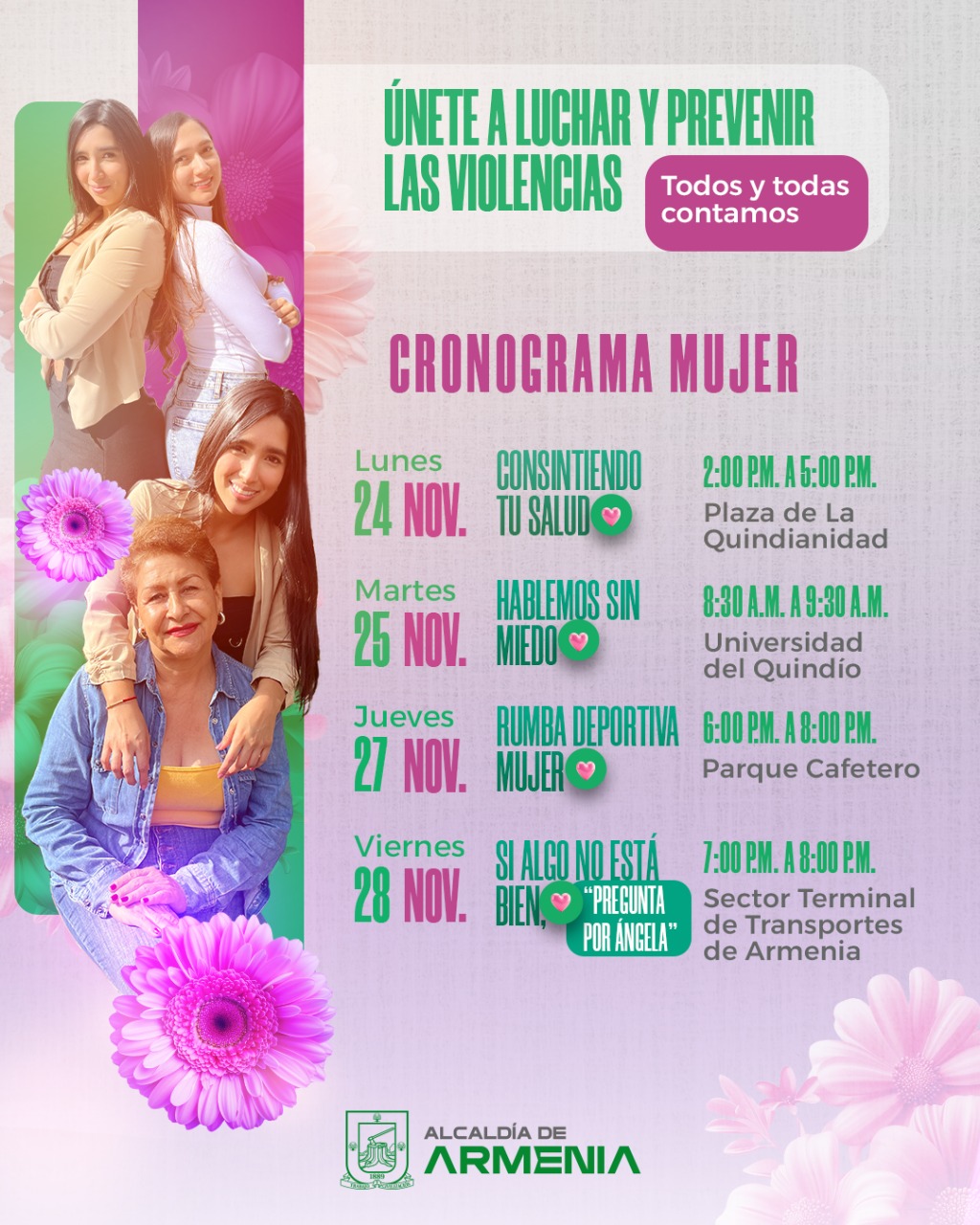 Entre las actividades están jornadas de prevención y promoción en salud, en la Plazoleta de la Quindianidad; foro académico el género como violencia política; foro para mujeres diversas Habla sin Miedo y otras jornadas de acompañamiento y rumba deportiva en diversos puntos de la ciudad.