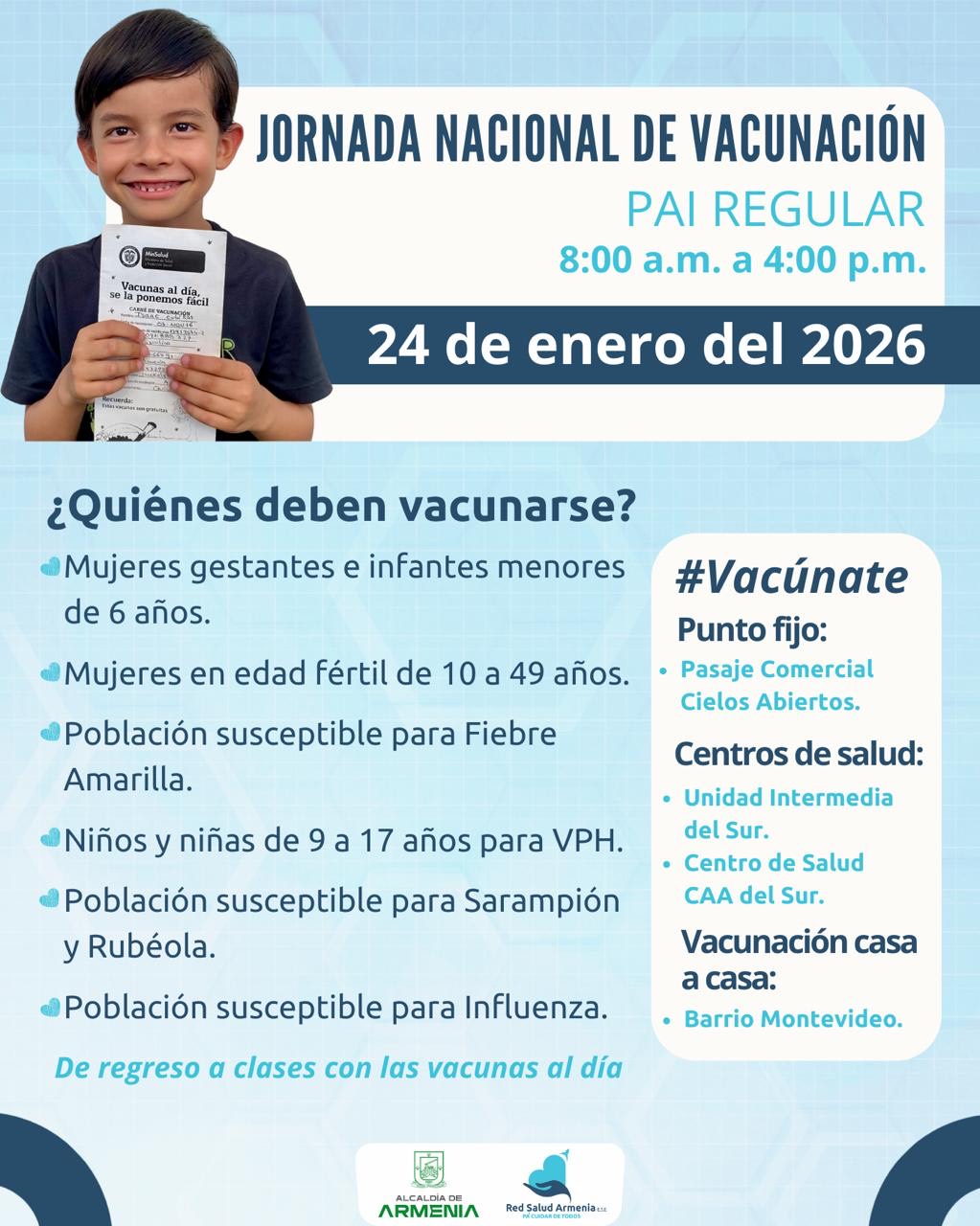 Red Salud Armenia ESE se suma a la Primera Jornada Nacional de Vacunación, estrategia liderada por el Ministerio de Salud y Protección Social que busca fortalecer la prevención de enfermedades y proteger la salud de toda la población, especialmente de los grupos más vulnerables. La jornada se realizará el próximo sábado 24 de enero de 2025, entre las 8:00 a.m. y las 4:00 p.m., en diferentes puntos de vacunación habilitados en el municipio de Armenia.