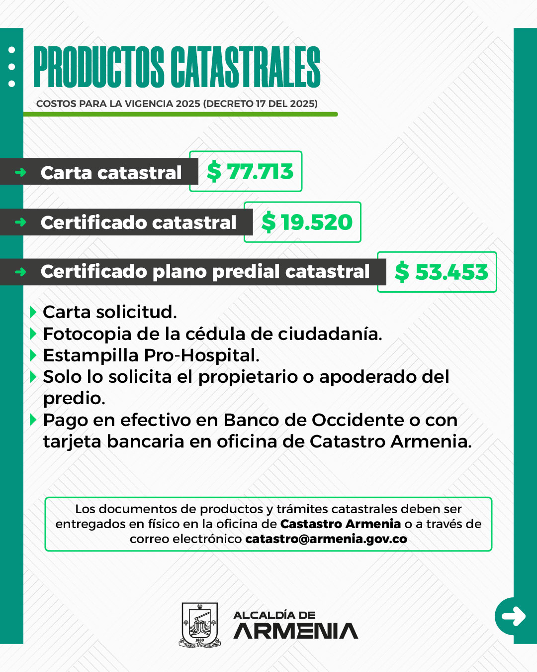 - • Decreto 17 del 20 de enero de 2025 "Por el cual se fijan los precios de los bienes y servicios para la vigencia 2025 del gestor catastral del municipio de Armenia Quindío y se dictan otras disposiciones"