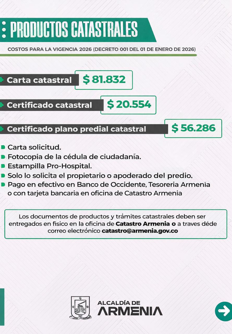 - • Decreto 001 del 01 de enero de 2026 "Por el cual se fijan los precios de los bienes y servicios para la vigencia 2026 del gestor catastral del Municipio de Armenia Quindío y se dictan otras disposiciones"