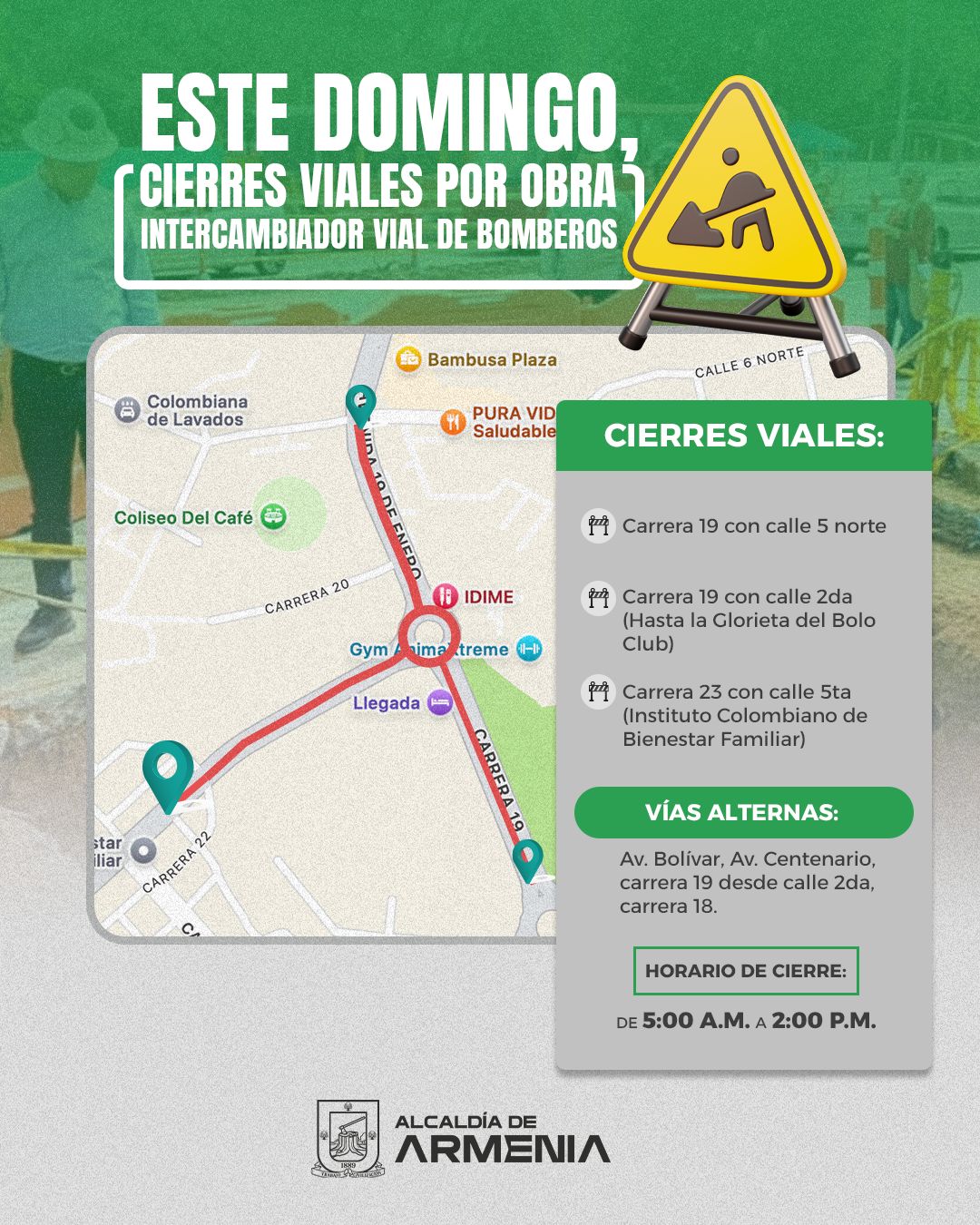 La Secretaría de Tránsito y Transporte de Armenia anunció cierres viales, entre las 5:00 a.m. y las 2:00 p.m. del próximo domingo 30 de noviembre de 2025, en inmediaciones del Intercambiador de Bomberos.