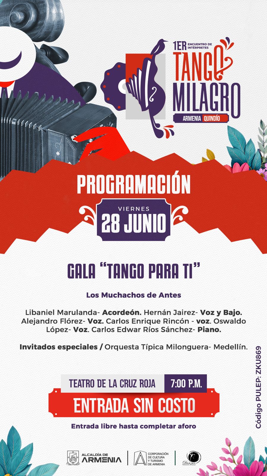 Después de compartir en este abrebocas del Primer Encuentro de Intérpretes de Tango, Tango Milagro, un taller pedagógico dirigido por el maestro Marcelo Tommasi y un conversatorio, a cargo de Ricardo Montoya, Darío Tobón y James Padilla Motoa; los armenios podrán disfrutar hoy y mañana de dos noches llenas de talento local, nacional e internacional en el Teatro de la Cruz Roja, donde podrán deleitarse con un show de música, canto y danza en torno al tango.
