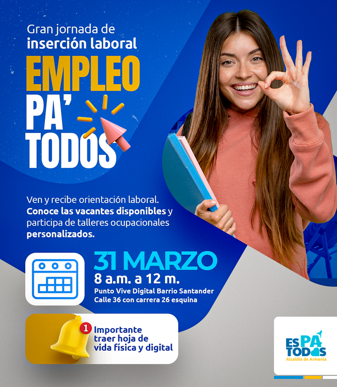 La Secretaría de Desarrollo Económico invita a la ciudadanía a participar de la Jornada de Inserción Laboral de hoy jueves 31 de marzo, de 8:00 a.m. a 12:00 m., en el Centro de Desarrollo Comunitario del barrio Santander. En esta actividad la persona que busca empleo puede tener un acercamiento con el empresario, entregar la hoja de vida, participar en el proceso de selección y enterarse durante el desarrollo de la jornada si es aceptado para ocupar la vacante. La hoja de vida debe presentarse de manera física y digital.