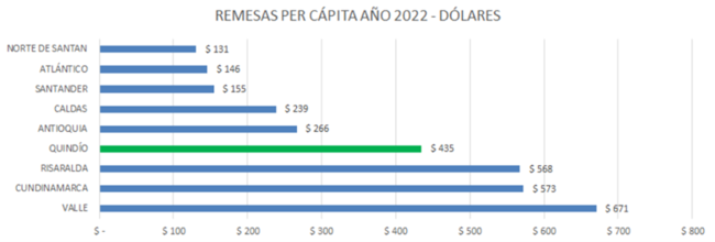 Para el año 2022, el departamento que recibe mayor cantidad de remesas es el Valle, con 3.102 millones de dólares, seguido por Cundinamarca con 1.909 millones de dólares, Antioquía con 1.807 millones de dólares. Entre el conjunto de departamentos, el Quindío recibe en total 243 millones de dólares.