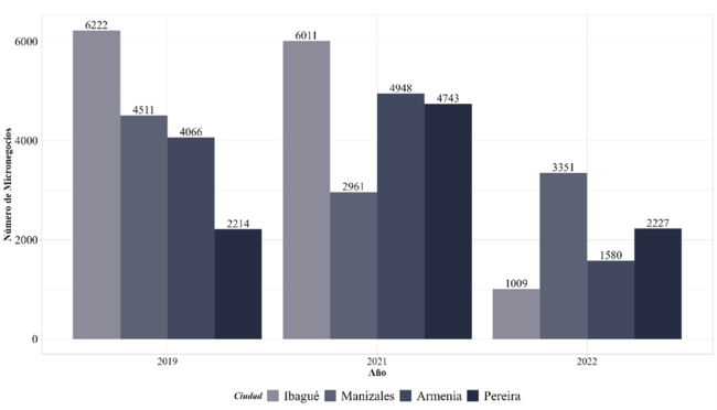 Los micronegocios identificados en el contexto de la economía popular exhibieron una dinámica inicialmente volátil, marcada por la referencia al año base. No obstante, los periodos subsiguientes no reflejaron la misma tendencia. El análisis del total de micronegocios estandarizados por población reveló que Armenia registró 14 micronegocios de baja escala por cada mil habitantes en el año inicial, aumentando a 16 en 2021, pero experimentando una reducción a 5 en el último año. La capital quindiana ocupó la posición líder en los dos primeros años de análisis, mientras que en el año 2022 descendió al segundo lugar en el mismo ranking. A pesar de la volatilidad en cifras absolutas, se evidencia que Armenia se ha mantenido consistente entre las economías de baja escala de la región cafetera.